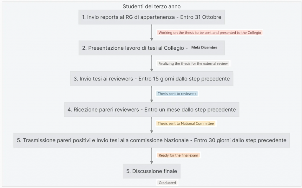 - Le valutazioni espresse per gli studenti del terzo anno, così come approvate dal Collegio, verranno inviate ai membri della commissione finale, in aggiunta alle relazioni di terzo anno dei dottorandi ed ai commenti forniti dai revisori esterni.